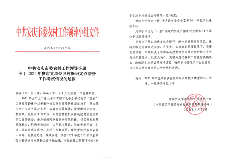 2021年,在市鄉(xiāng)村振興局、片區(qū)牽頭單位和組長(zhǎng)單位的悉心指導(dǎo)下,同安控股在2021年度市直單位鄉(xiāng)村振興定點(diǎn)幫扶工作考核中再獲“好”等次,被市委農(nóng)村工作領(lǐng)導(dǎo)小組通報(bào)表?yè)P(yáng)。