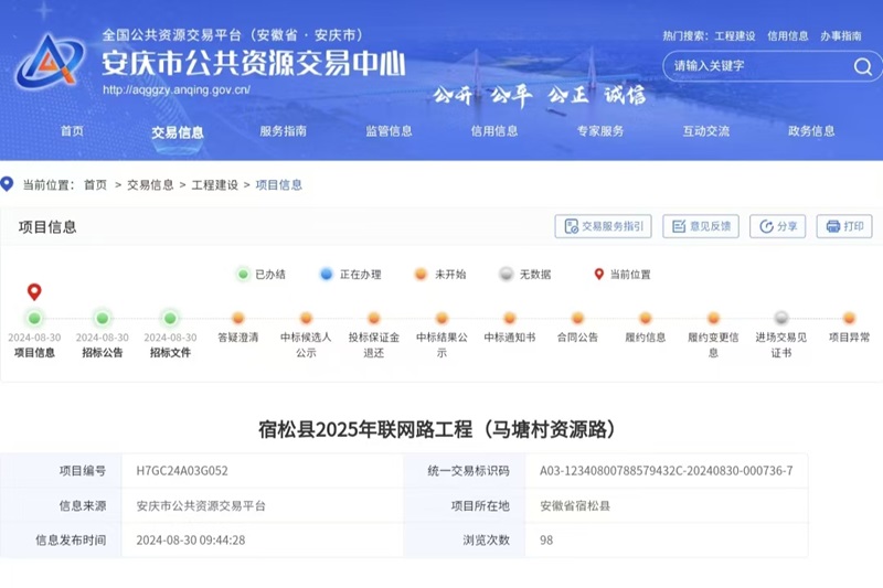 8月30日,九姑白鷺山礦外運道路——宿松縣2025年聯(lián)網(wǎng)路工程(馬塘村資源路)項目施工招標公告發(fā)布。